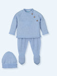 3-piece cloud blue knit set. It includes a long-sleeve sweater, matching footies and a hat. The sweater fastens with buttons on the shoulder. The footies are gently elasticated around the...