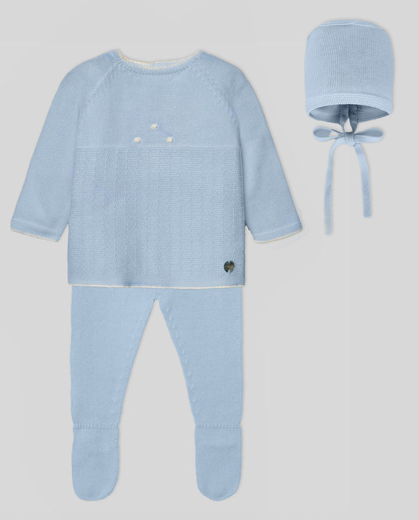 Three-piece cloud blue knit set for baby boys. It includes a long-sleeved sweater, footies and a bonnet. Knitted in soft cotton, the top is adorned with a mother-of-pearl logo on...
