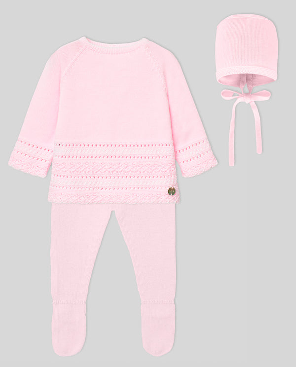 Three-piece pink knit set for baby girls. It includes a long-sleeved sweater, footies and a bonnet. Knitted in soft cotton, the top features an intricate detail and is adorned with...