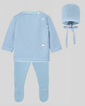 Three-piece cloud blue knit set for baby boys. It includes a long-sleeved sweater, footies and a bonnet. Knitted in soft cotton, the top fastens with buttons on the shoulder and...
