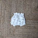 Baby girl bloomer and sweater set. The powder pink knitted sweater has a ruffled and scalloped collar and it fastens on the back with buttons. The white bloomers with a pink and blue floral print are elasticated around the waist and leg cuffs. Mebi is a small fitting brand, we recommend sizing up.