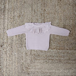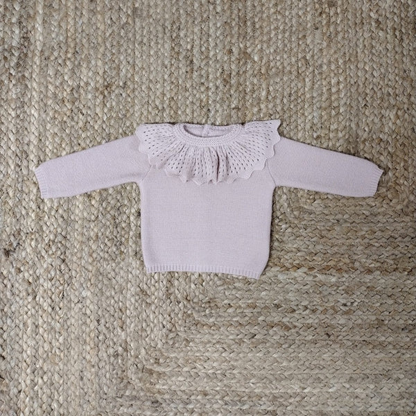 Baby girl bloomer and sweater set. The powder pink knitted sweater has a ruffled and scalloped collar and it fastens on the back with buttons. The white bloomers with a...