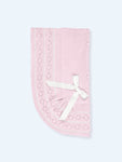 Pink knit blanket, it has a ruffled all around and a white satin bow. It matches newborn knit set Cala Monsul.