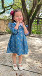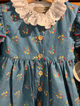 This dress is made in a deep blue cotton fabric featuring a colorful floral pattern. The ruffled collar in white embroidery cotton adds a beautiful touch. It has long sleeves...
