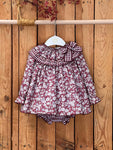 Dress for little girls in a cute bordeaux floral print. The dress has long sleeves with frilled cuffs. It has a double ruffled collar with a bow in a contrasting...