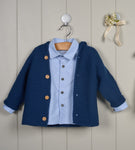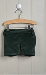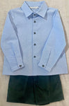 This boy set includes an Oxford button-down light blue shirt, and dark green corduroy shorts. The shirt has long sleeves. The shorts have an elasticated waist and side pockets.