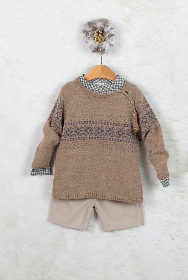 Light brown knitted sweater with a dark blue pattern across the front and back. It fastens with wooden buttons on the shoulder. Mebi is a small fitting brand, we recommend...