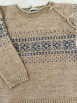 Light brown knitted sweater with a dark blue pattern across the front and back. It fastens with wooden buttons on the shoulder. Mebi is a small fitting brand, we recommend sizing up.
