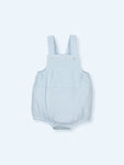 Baby romper made in seersucker white and blue fabric. Made in lightweight cotton, it is elasticated around the back and leg cuffs. It fastens with buttons on the cross-back straps...