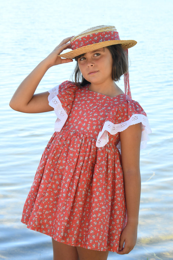 Red dress in a small white floral print. It has flutter sleeves with white embroidery, and it fastens on the back with wooden buttons.