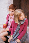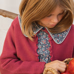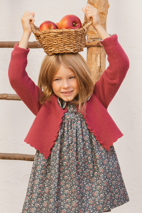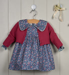 Classic dress for little girls. Made in a dark blue fabric with a dark red, white and green small floral print. It has an oversized collar and long elasticated sleeves...