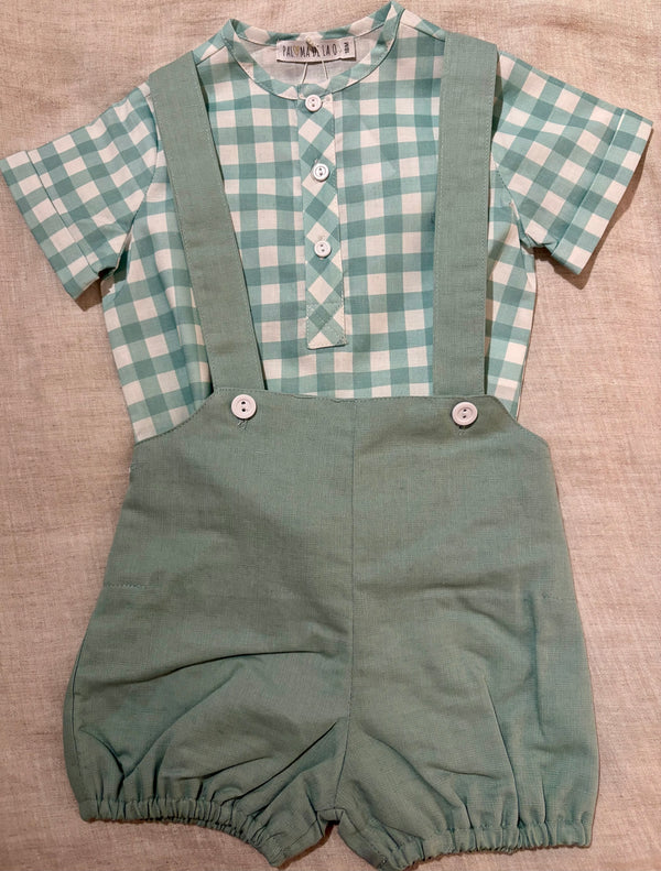 Beautiful dungarees set for baby boys. The short-sleeved collarless shirt is made in a green and white gingham fabric. Made in lightweight cotton, the shirt fastens with buttons on the...