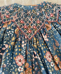 Beautiful hand-smocked bloomer set in a blue floral print. The long-sleeved dress fastens with mother-of-pearl buttons on the back. The bloomer is elasticated around the waist and leg openings.
