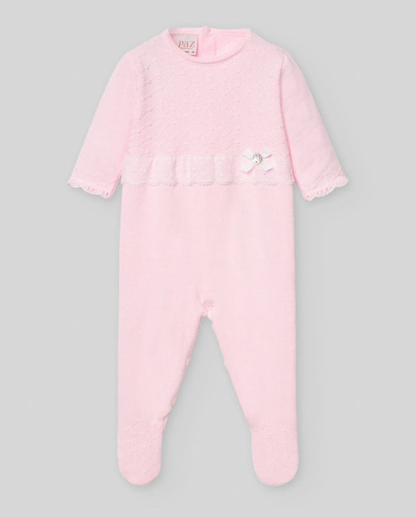 Pink knit babygrow for baby girls. Knitted in soft cotton, the bodice has an intricate diamond pattern and is adorned with white lace and a small bow with a mother-of-pearl...