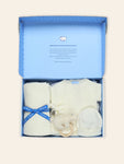 Beautiful unisex gift box for a newborn baby. It includes a 3-piece ecru knit set (long-sleeved sweater, matching footies and hat), a matching blanket and a rattle. The kimono sweater ties on the side, allowing for easy changes.