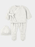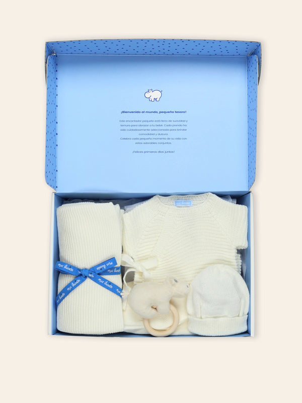 Beautiful unisex gift box for a newborn baby. It includes a 3-piece ecru knit set (long-sleeved sweater, matching footies and hat), a matching blanket and a rattle. The kimono sweater...