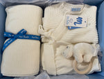 Beautiful unisex gift box for a newborn baby. It includes a 3-piece white knit set (long-sleeved sweater, matching footies and hat), a matching blanket and a rattle. The kimono sweater...