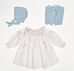 Smocked dress in a delicate pale pink and blue floral pattern. It has a beautiful hand-embroidered flower detail around the collar and has pink bows on the shoulders. The long sleeves are elasticated and it fastens with buttons on the back.